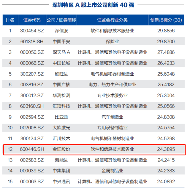 金證股份榮登“深圳特區A股上市公司創新40強”