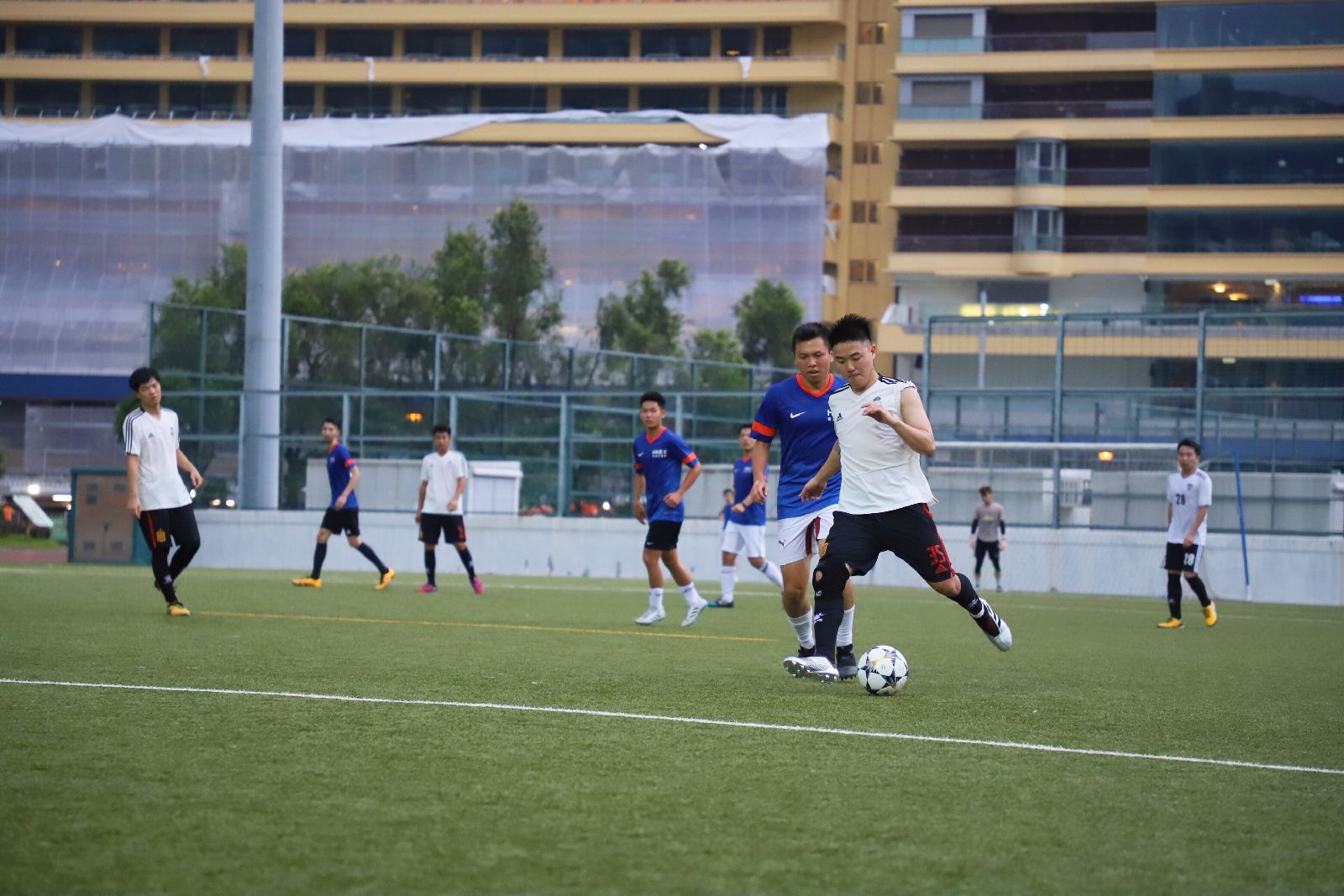 在第二場“青年組”的比賽中,由于雙方年輕隊員的加入,比拼更顯激烈。碰撞、倒地時有發生,使得賽事更加精彩紛呈。比賽伊始,雙方爭搶不斷,主場作戰的港交所主力隊員以專業的技術、快速的節奏以及高度協作的團隊精神對金證隊展開猛烈的進攻,并牢牢控制住了場面局勢。金證隊面對對方咄咄逼人的攻勢,積極組織整體防守并伺機制造反擊。在一次角球中,雙方在港交所隊門前形成混戰。最終,金證隊前場組織核心張海龍趕在門將出擊前鏟射破門,先拔頭籌。場上的僵局被打破后,雙方均采取了針對性戰略,比賽場面精彩不斷。
